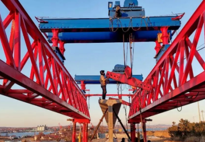 龍門吊起到的是起重功能,千斤頂在液壓控制系統(tǒng)的控制下,可以根據(jù)指令慢慢牽引大噸位的鋼箱梁,使之精準轉體,落入到指定位置,控制系統(tǒng)還能傳回千斤頂?shù)捻斏龜?shù)據(jù)。